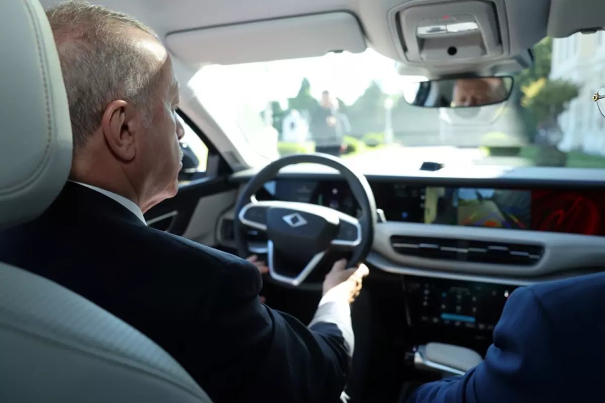 TOGG’un yeni modeli T10F’nin direksiyonuna geçen Cumhurbaşkanı Erdoğan, deneme sürücü gerçekleştirdi.