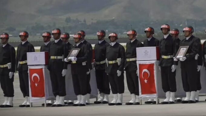 Yüksekova Selahaddin Eyyubi Havalimanı’nda düzenlenen törende şehit İstihkam Üsteğmen Ege Akar, Mühimmat Astsubay Kıdemli Çavuş Abdurrahman Akdoğan, piyade sözleşmeli erler Ahmet Kuşak, Özkan Özkanlı, Ahmet Gültekin ve Mahsun Yeşildemir’in Türk bayraklarına sarılı naaşları alana getirildi.