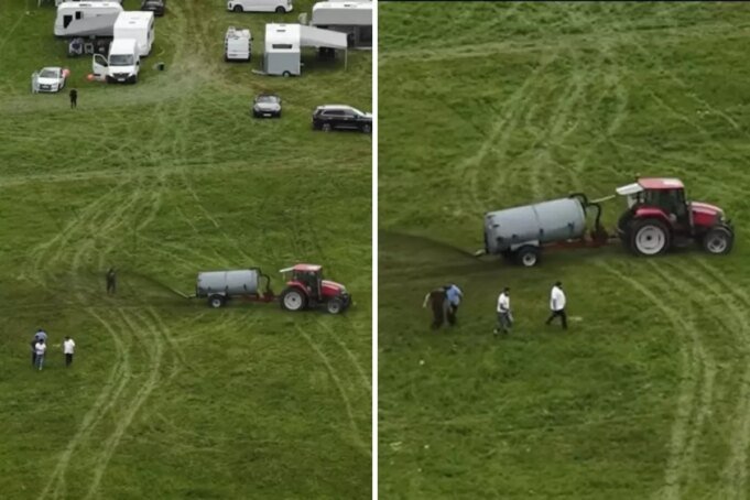 Olay anına ait videoda, beyaz karavanların çevresinde dönen en az altı traktörün çamurlu sıvıyı kamp alanına püskürttüğü görülüyor. Kampçılar, püskürtülen dışkıyı durdurmaya çalışırken, bir kişi hareket halindeki traktöre atlayarak sürücünün camına vurdu.