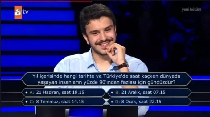 Programın yeni bölümündeki sorular, seyircilerde büyük bir ilgi uyandırıyor. Yarışmacının ne cevap vereceğini merak eden izleyiciler, aynı anda kendi cevaplarını da düşünerek bilgi düzeylerini test ediyor. Bu eğlenceli öğrenme ortamı, izleyenlerin kendilerini yarışmacının yerine koymasına ve bilgi dolu dakikalar geçirmesine imkân tanıyor. Peki, Yıl içerisinde hangi tarihte ve Türkiy’de sat kaçken dünyada yaşayan insanların yüze 90’ından fazlası için gündüzdür?